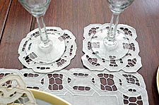 ![]() Dynasty Style Fancy Embroidered Cutwork. 6"x9" rectangular napkin All cotton. $36.00 per dozen. | Princess Anne Style Battenburg Lace design 7 inches square napkins White or ecru color All cotton. |