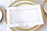 Edinburgh Style Double & Wide Hemstitch 6x9" rectangular napkin All cotton. $36.00 per dozen | Dynasty Style Fancy Embroidered Cutwork. 6"x9" rectangular napkin All cotton. $36.00 per dozen. |